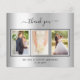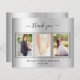 Adicione 3 das suas próprias fotos e um obrigado da sua nota. Um fundo metálico de aparência fina prateada com texto e quadro negros. O texto: Obrigado na frente e seus nomes no verso são escritos com um roteiro à mão com na moda com hastes.