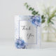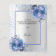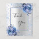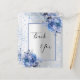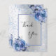 Fundo com aspecto fino prateado, decorado com brilho azul claro, cinzas e florais azuis.Na frente, o texto em letras grandes à mão e o texto: Obrigado. Voltar: Personalize e adicione sua nota de agradecimento e seu nome.