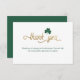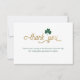 Este cartão de nota de agradecimento elegante e elegante apresenta um trevo verde de quatro folhas (shamrock) acima das palavras "Obrigado" em uma fonte de script dourada (folha simulada). O fundo é branco, mas pode ser alterado para qualquer cor de sua escolha. A parte de trás do cartão está verde e também pode ser alterada para qualquer cor de sua escolha.
