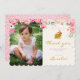 Esta é a maneira perfeita de agradecer a seus convidados para fazer o special do aniversário do seu coelho pequeno. A aguarela pintado mão floresce nas máscaras do rosa mistura com pontos do ouro para moldar a foto de sua menina doce. O coelho Dourado descansa-o sobre o obrigado texto que termina este cartão doce. Os cartões de agradecimentos têm o convite de harmonização do aniversário disponível. Rosa com as bolinhas brancas no reverso.