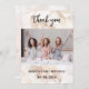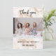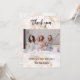 Um aniversário moderno. Obrigado, cartão com fotos. Penônio branco, flor como fundo. Personalize e adicione sua foto e obrigado nota.