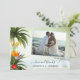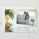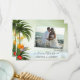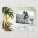 Cartões de agradecimentos de casamento com sua foto favorita de casamento, enquadrada por uma cena de praia tropical com palmeiras, lanternas festivas e flores exóticas coloridas, com vista para um oceano verde-claro. (Sua foto deve girar automaticamente para ajustado do quadro).