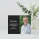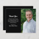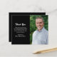 Cartões de agradecimentos de funeral de orçamento negro moderno com um design simples e minimalista com sua foto favorita do falecido junto com sua mensagem personalizada à esquerda. "Obrigado" e o nome do falecido está em uma escrita elegante.