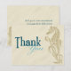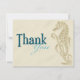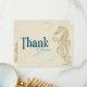 Este cartões de agradecimentos totalmente personalizável apresenta uma impressão de cavalo marinho na areia com as palavras "Obrigado" escritas em duas tonalidades de azul na frente. O outro lado pode ser personalizado com um obrigado pré-impresso que você envia ou vazio esquerdo para uma nota pessoal e manuscrita de obrigados. MAR001