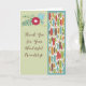 Um cartão verde bonito com uma grande área oblonga de círculos coloridos, longos, com uma fronteira turquesa, e um design floral. A dentro do cartão é vazio para que você possa adicionar suas próprias palavras.