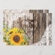 Madeira rústica com rendas brancas e estrias cardíacas e cartões de agradecimentos de buquê de girassol.