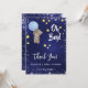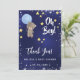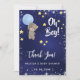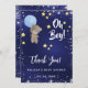Um fundo azul marinho. A cor azul é irregular. Um ursinho de pelúcia segurando estrelas de balões azuis e reluzentes. Personalize e adicione nome(s) e uma data na frente. O nome e o texto: Oh Boy! são escritos com um estilo escrito manualmente Back: Obrigado nota e nome(s)