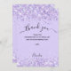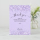 Um fundo violeta, decorado com falso brilho, faíscas. Escrita escrita com letras grandes com baloiços e o texto: Obrigado. Personalize e adicione sua nota de agradecimento e seu nome.