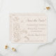 Cartões de anúncio de data de casamento religiosos contemporâneos modernos creme e branco, também convites com cruz, videira e padrão de fundo damasco. Design creme e branco, lindo para qualquer cerimônia de casamento religioso. Apresenta versículo da bíblia de 1 coríntios 13 no verso, O amor nunca falha. (Ou personalize com sua própria escritura ou versículo da bíblia.) Personalize online com os detalhes do seu casamento.
