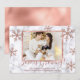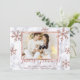 Cartões de Anúncio de Gravidez de Natal. Futuros pais! Tipografia moderna escrita à mão em rosa "O amor está crescendo!" cartão para compartilhar a sua notícia feliz com familiares e amigos na temporada de festas. Apresenta moldura de floco de neve com brilho em dourado rosa falso sobre fundo de mármore cinza branco. No centro, um modelo de foto horizontal com moldura de folha de ouro rosa. No verso, fundo de folha de ouro rosa falso. Você pode personalizar o design substituindo os textos e a foto vertical. #3349 Se precisar de ajuda ou itens correspondentes, por favor entre em contato comigo!