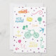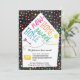Cartões de convite móveis com uma pequena casa divertida e esquisita com o novo dentro de detalhes de endereço e com a letra de "New Home Sweet Home" em cima com uma chave e um balão. Na parte de trás está uma ilustração bonita de padrão preto e branco de uma bicicleta, carro, chave, balão de ar e texto "Nós nos movemos!". Tudo em cores divertidas do arco-íris perfeitas para famílias com crianças!