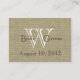 A aparência de Burlap e um arco impresso neste cartaz de casamento. Vinculando convites, personalize o texto conforme necessário. Adicione os nomes da noiva e do noivo com um monograma e data de casamento às costas. Este produto está impresso. Não há burlap real nem nenhum arco real incluído neste produto.