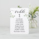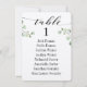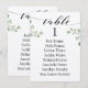Fonte de caligrafia preta com floreios contra papel branco crocante com raminhos de eucalipto verde para cartões de mesa de oito convidados.