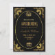 Estes convites de casamento glamourosos têm uma arte moderna e semiclássica. Um ornamentado, uma armação de flores douradas e ornamentação decoram um elegante fundo preto-onyx-escuro para um olhar dramático e casamento vintage.
