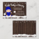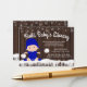 Cartões de chuvade bebê menino traga um livro com adorável bebê menino vestindo um lindo traje de inverno azul escuro com chapéu em um fundo de madeira rústica e flocos de neve. Adicione seu texto na frente e atrás para personalizar para o seu evento.