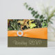 Cartões de RSVP de Casamento com Camuflagem de Caça - cada cartão RSVP apresenta uma fita laranja impressa em volta com um enfeite de fivela redonda diamantada. Abaixo da fita impressa, a metade inferior apresenta uma impressão marrom-esverdeada manchada em tons terrosos. Acima da fita, na metade superior de cada convite, é exibida uma impressão elegante de camuflagem de caça com tons de verde-musgo, marrom, bege, cinza e outras cores ao ar livre. A impressão de camuflagem apresenta galhos, folhas, cascas e outros detritos. O design envolve a parte de trás e apresenta o mesmo design com uma caixa de texto esbranquiçada e elegante que permite que os gráficos sejam visíveis. O cartão de RSVP é feito de papel tipo linho para adicionar elegância; no entanto, você pode alterar o tipo de papel para básico, feltro ou metálico no botão laranja "personalizar" abaixo da demonstração do cartão RSVP. Cada cartão RSVP vem com um envelope branco.