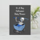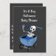 Um cartão original do convite do chá de fraldas do Dia das Bruxas que oferecesse um esqueleto pequeno do bebé que se senta acima em uma luz - pram azul, coberto por uma cobertura azul e agitando um osso deu forma ao chocalho de esqueleto como a imagem central no cartão do convite. A parte traseira do é um chá de fraldas que do Dia das Bruxas do menino o cartão vem com detalhes completos da informação do partido junto com a mesma imagem de esqueleto do bebé adorável que se senta à direita do fraseio. Todo o fraseio pode ser personalizado com seus próprios detalhes do partido de chá de fraldas do Dia das Bruxas.