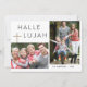 Este cartão de Natal contemporâneo de duas fotos apresenta um design religioso moderno. A palavra "Aleluia" é escrita em simples letras negras com uma pequena cruz de ouro. Personalize facilmente com suas fotos favoritas e seus nomes. A parte traseira do cartão é vazio de acomodar fotos adicionais ou uma mensagem de ano em revisão, se desejar. A cor de fundo da cinza clara no verso pode ser alterada para qualquer cor que você quiser.