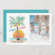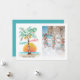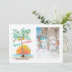 Um Cartões de foto de Natal plano do tema da praia tropical apresenta uma ilha ao sol com uma palmeira decorada com luzes de cordas e ornamentos e uma saudação de "feriados felizes" junto com um espaço para substituir a foto da amostra pela sua. Arte por KL Stock