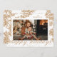 Este elegante cartão com fotos de feriado apresenta uma borda desenhada à mão com folhagem ouro de inverno e um guião florescente saudando a leitura de "feriados felizes", destacando um solteiro personalizável para um sentimento clássico de feriado tradicional. O verso adiciona um interesse único com um padrão de folhagem dourado correspondente.