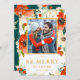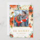 Cartões de foto de Natal com flores vermelhas e folha de ouro falsa. Flores vermelhas e cremes de aquarela e botânicos verdes enquadram sua foto com "Seja Feliz" em ouro com o nome e o ano.