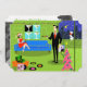 Estas Cartões de foto de Natal Urbanas Personalizáveis apresentam o desenho animado de um elegante apartamento de penthouse, todos decorados para os feriados com fios coloridos de luzes de Natal e uma gatinha, rosa, árvore de Natal, cheia de enfeites e uma estrela amarela. O apartamento tem um chão verde e uma parede de tijolos verdes. Na parede estão quatro Classic Movie Martini Stretered Canvas Prints, também disponível na loja Zazzle da StrangeLittleOnion (dica, dica!). Três dos impressões apresentam fundo turquesa e um está sobre fundo preto. Abaixo das telas impressas, está um sofá azul, meio século moderno. Uma beleza sofisticada e cabeleira está sentada no sofá. Ela está vestindo um vestido vermelho e vibrante e um chapéu de Papai Noel. Em uma mão, ela está segurando um punho de maleta amarrado com um arco vermelho. No lado oposto da sala há um homem suave, alto, escuro e bonito. Ele está vestindo um terno preto, camisa branca e gravata vermelha. Por um lado, ele está segurando um álbum de vinil e, por outro, ele está segurando um cobrir divertido. No chão, há um otomano laranja segurando um toca-discos verde e preto. Projetado contra o otomano é outro cobrir de álbum com um registro sendo lançado para fora do lado. Há também três álbuns coloridos de vinil espalhados pelo chão. Atrás do homem, podemos ver, através de portas de vidro deslizantes, neve caindo em uma varanda verde e a cidade abaixo. Um gato branco vestindo um arco vermelho ao redor do pescoço está preso na borda da sacada. Além do gato, há uma linha do horizonte da cidade que respira, cheia de arranha-céus e uma lua crescente amarela. O lado oposto está pronto para você substituir a foto e a mensagem de modelo por uma de suas. Se é assim que a outra metade vive, inscreva-me! Fotografia © Storytree Studios, Stanford, CA