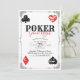 Estes convites para festas ou eventos de jogos de pôquer se assemelham a um cartão de jogo de um baralho. Os quatro símbolos de um baralho - paus, corações, diamantes e espadas - são colocados com um em cada canto. A palavra "POKER" é impressa em uma antiga fonte do estilo ocidental. O título "noite de jogo" está por baixo dela com uma sofisticada fonte vermelha. Um quadro de estilo antigo borda o convite. A parte de trás do convite apresenta um padrão que se parece com a parte de trás de um cartão de jogo padrão.