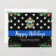 Mande saudações de Feliz Natal para amigos, negócios' , colegas departamentos de polícias e sua comunidade com este único Cartão de Natal do Departamento de Polícia de Linha Azul - Bandeira Americana em cores de bandeira policial, preto e azul moderno com folhas e bagas ocas. Personalize com o logotipo, a mensagem e o departamento da polícia. Esses cartões postais de natal de alegria orçamentária precisam ser enviados como cartões postais de tamanho excessivo, de modo que possam implicar taxas de postagem padrão, mas eles não precisam de um envelope ou etiqueta de endereço de retorno. COPYRIGHT © 2020 Judy Burrows, Black Dog Art - Todos Os Direitos Reservados. Cartões postais de Natal Thin Blue Line