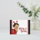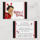 Cartões de chá de bebê 'traga um livro' com adorável menina étnica vestindo um lindo traje de joaninha vermelho e preto em um fundo vermelho e preto com texto de joaninha vermelha fofo na frente. Você pode alterar a cor do fundo da borda. Adicione o texto de sua escolha no estilo de fonte que preferir.