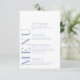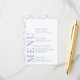 Melhore o encanto da sua celebração romântica de casamento russa com este cardápio sofisticado e polido. Com um intrincado padrão adornado com delicadas flores azuis-claras, essa bela design é elevada com personalização, mostrando os nomes da noiva e do noivo no verso. Perfeito por adicionar um toque extra de atração ao seu dia especial.