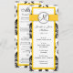 Cartões de Menu de Casamento com padrão de damasco preto e branco e cor de destaque amarela com monograma. Em um lado, o cartão tem detalhes sobre os eventos da recepção de seu casamento. No outro está o menu de casamento. Personalize com seu monograma, nomes, data de casamento, menu de recepção e eventos. Por Elke Clarke ©2011 Personalize com suas informações e cores