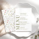Melhore a experiência do seu casamento em prado rústico com um cartão de menu de aquarela caprichosa. Exibindo um padrão elegante e delicado de flores silvestres coloridas, o toque personalizado do monograma dos noivos no verso adiciona um elemento memorável ao design geral.