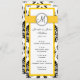 Cartões de Menu de Casamento com padrão damasco preto e branco e cor de destaque amarela com monograma. Em um lado, o cartão tem detalhes sobre os eventos da recepção de casamento. No outro está o menu de casamento. Personalize com seu monograma, nomes, data de casamento, todo o menu da recepção de casamento e eventos. Por Elke Clarke ©2011 Personalize com suas informações e cores
