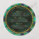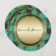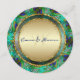 Penas de pavão design com as vibrantes cores do pavão em um padrão sem soldadura. Torna isto num espetacular evento especial / menu casamento - que pareceria excelente colocado nos pratos de convidados do casamento. Tema: Sombras brilhantes de verde, azul-indigo, ouro ・ ♦ ・ Menu personalizável de recepção de casamento dupla lateral ou menu de janto com outro lado do cartão com layout elegante para noiva e noivo, datas de casamento e monograma/iniciais. ♦ ・ Personalize com suas informações especiais. Eu adicionei texto usando o estilo curvo em ambos os lados deste belo menu redondo para facilitar para você ... Se você não precisar, apenas exclua (deixe o vazio de espaço).