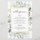Design apresenta uma elegante imagem geométrica de cor dourada impressa na frente com eucalipto e folhas verdes florais em tons de verde, azul empoeirado, cinzas e muito mais. A parte traseira apresenta um fundo texturizado de lavagem de cor d'água de cinza azul empoeirado.