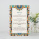Vintagem colorida de Teal Blue e marrom cartões de cardápio mexicanos talavera azulejo, letra casual de escrita manual com cartões de recepção de casamento