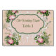 Um Jardim Bush Vitoriano Verde com Rosas Cor-de-Rosa e faixa de renda creme - branca com cartões de número e nome para cada mesa
