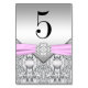 Lindas rendas prateadas com laço de diamante rosa impresso. Adicione seus detalhes no estilo de fonte e cor, e a palavra de sua escolha na frente e no verso deste elegante cartão de mesa rosa.