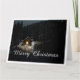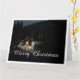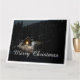 A carta mostra uma cena atmosférica, enrolada, com uma pequena cabana de madeira iluminada no meio de uma floresta coberta de neve. O dentro da fonte de luz quente cria um belo contraste ao meio escuro e pacífico. A elegante inscrição "Feliz Natal" em branco dá ao motivo um toque festivo. 🎄 ✨
