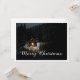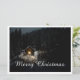 A carta mostra uma cena atmosférica, enrolada, com uma pequena cabana de madeira iluminada no meio de uma floresta coberta de neve. O dentro da fonte de luz quente cria um belo contraste ao meio escuro e pacífico. A elegante inscrição "Feliz Natal" em branco dá ao motivo um toque festivo. 🎄 ✨
