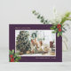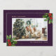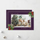 Cartões de Natal com uma cor d'água roxa elegante, com um quadro fotográfico roxo decorado com ilustrações de cor d'água de holly com bagas e faux gold foil confetti. Personalize facilmente esses Cartões de foto de Natal de aquarela roxos com sua imagem e texto.
