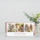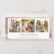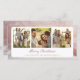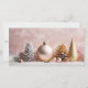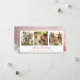 Este cartão de Natal apresenta um arranjo elegante e festivo com um fundo macio e rosado. A frente do cartão tem três espaços reservados onde você pode carregar suas próprias fotos da família, adicionando um toque personalizado aos seus cartões de natal. "Feliz Natal" está inscrito em na moda, trazendo calor e alegria ao cartão. Os elementos decorativos incluem: Uma grande bola de Enfeites de natal de ouro mate com um boné metálico. Vários pínus, alguns pintados de prata e outros de ouro, pintados com neve artificial. Uma decoração em forma de cone, dourada. Bolhas cor-de-rosa menor e douradas espalhadas em torno dos cones dos pinheiros e do ornamento maior. O esquema de cor geral de ouro, prata e rosa, combinado com os slots de fotos pessoais, cria uma atmosfera sofisticada e convidativa, fazer este cartão perfeito para compartilhar desejos festivos com entes queridos.