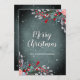 Belo cartão de Cartões de natal de Natal com folhagem de inverno e bagas vermelhas em um fundo escuro nevado.