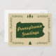 Um tema da natureza rústica inspirou design. O estado da Pensilvânia esboçou-se numa cor verde-floresta. O texto diz Saudações da Pensilvânia, mas você pode personalizá-lo com seu próprio texto. A borda é um galho foliar com alguns sotaques de pinheiros em cima e em baixo. O fundo é uma cor kraft castanha clara com textura de marca d'água floco de neve. Personalize estes cartões para a época de Natal. São também excelentes para uso geral.