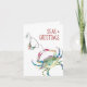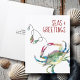 Estes cartões de Natal de praia apresentam um charmoso caranguejo aquoso com luzes de férias em tons de vermelho, verde, azul e turquesa em um fundo branco nítido. As palavras Seas e Saudações são colocadas num tipo vermelho bonito. A placa abre para revelar uma cor vermelha de baga sólida com sua saudação personalizada em branco. Use os campos modelo para adicionar suas informações personalizadas. Encomenda cartões impressos em grandes volumes ou cartões de Natal imprimíveis. Para ver mais designs, visite www.zazzle.com/dotellabelle. Arte de aquarela e design por Victoria Grigaliunas de Do Tell A Belle.