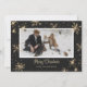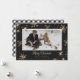 Cartões de natal bonitos de xadrez preto e branco de dois lados, com flocos de neve cintilantes e estrelas com título de caligrafia dourada e quadro fotográfico. Um fundo de xadrez de búfalo preto e branco nas costas.
