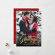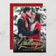 Comemore a época de Natal com esses cartões com fotos simplesmente elegantes. As cartas incluem sua imagem personalizada na frente, junto com um gradiente preto suave na borda inferior, e a palavra "Saudações" em um belo script de pincel de falso ouro, um pequeno floco de neve e seu texto. O verso tem uma cor de fundo vermelha festiva (que pode ser personalizada para qualquer sombra), uma borda de ponto brilhante dourada e mais do seu texto. Faça mudanças com os modelos fáceis. Personalize ainda mais para reorganizar e redimensionar elementos.
