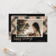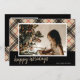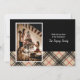 Feliz Feriado! Placa plana horizontal fotográfica personalizável com xadrez preta, bege e vermelha e tipografia de script na frente. Personalize adicionando 2 de suas fotos favoritas, nomes na frente e sobrenome atrás. Consulte nosso site para ver mais cartões de Natal e ideias de Natal—> www.tkmpartyprintables.com