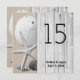 Cartões de número de mesa de casamento na praia quadrada frente e verso. Números, nomes e data do casamento são impressos em ambos os lados em preto, sobre uma imagem de madeira cinza (calçadão) com estrela-do-mar, dólar de areia e conchas na areia.