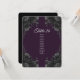 A floral de cinzas escuras e elegante com placas de assentos de mesa de fundo roxo escura são adoráveis para uma aparência de casamento gótica com um fundo preto. As flores adornam os cantos de um olhar elegante, moderno e sofisticado.